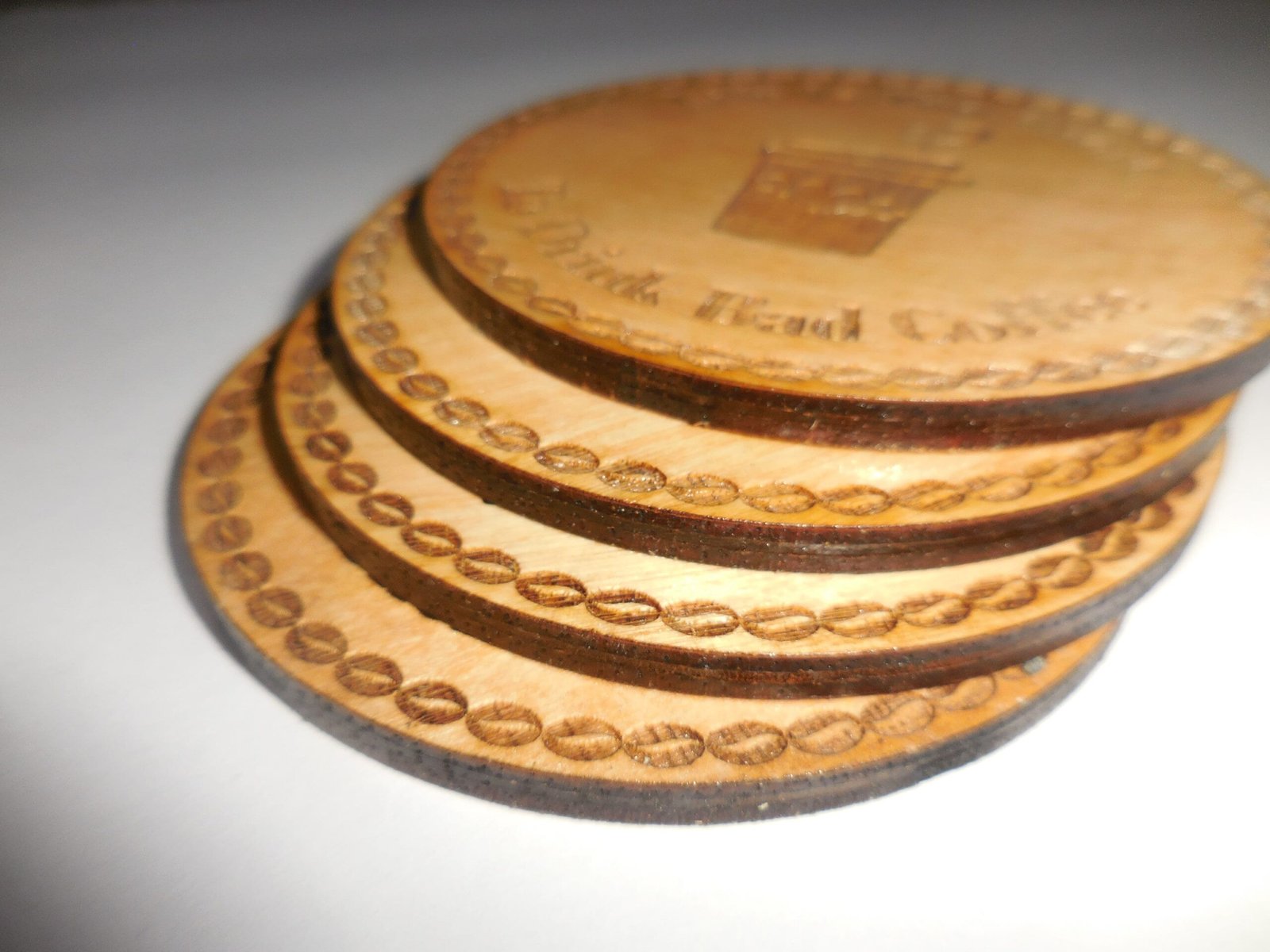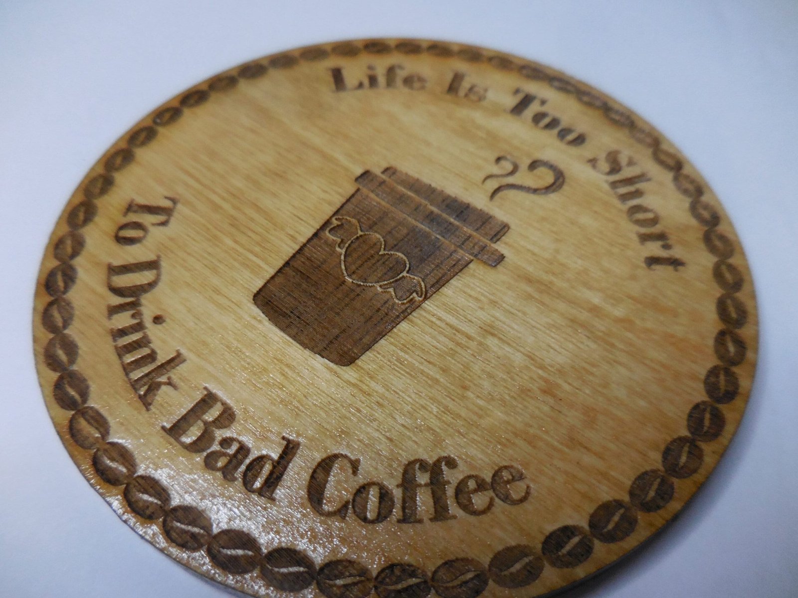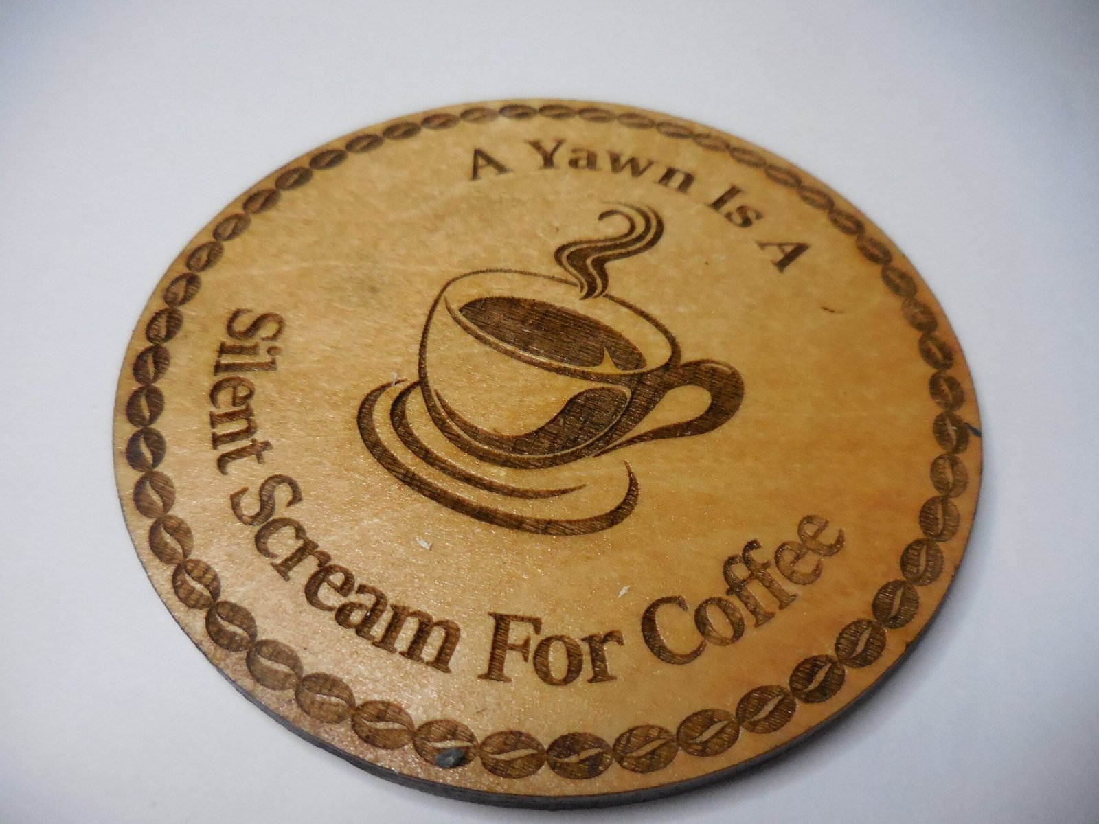 Plywood Protection: Coated with Urethane Coasters include the following four sayings (one of each): Coffee, the most important meal of the day A yawn is a silent scream for coffee Life is too short to drink bad coffee Hot coffee, happy day